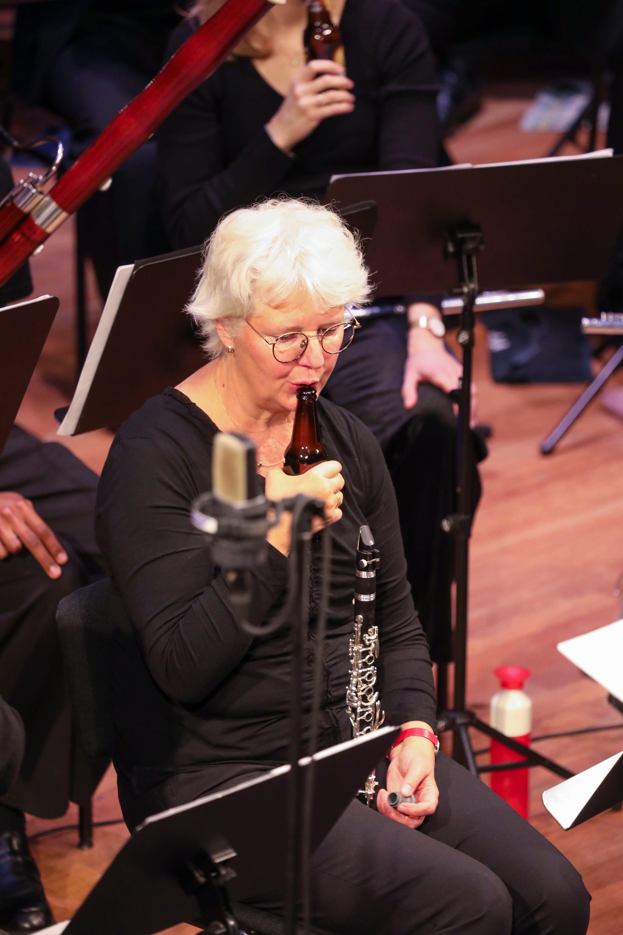 Na deze mooie start was het tijd om onze soliste te introduceren. Kim Grisel voerde met ons het Concertino voor Es-Klarinet van Bob Vos uit. Dit stuk is gecomponeerd in 1961, en wordt zelden uitgevoerd! Een modern klinkend werk, zeer uitdagend voor de soliste én het orkest. Kim deed het prachtig en liet horen hoe veelzijdig de klank van de es-klarinet is.